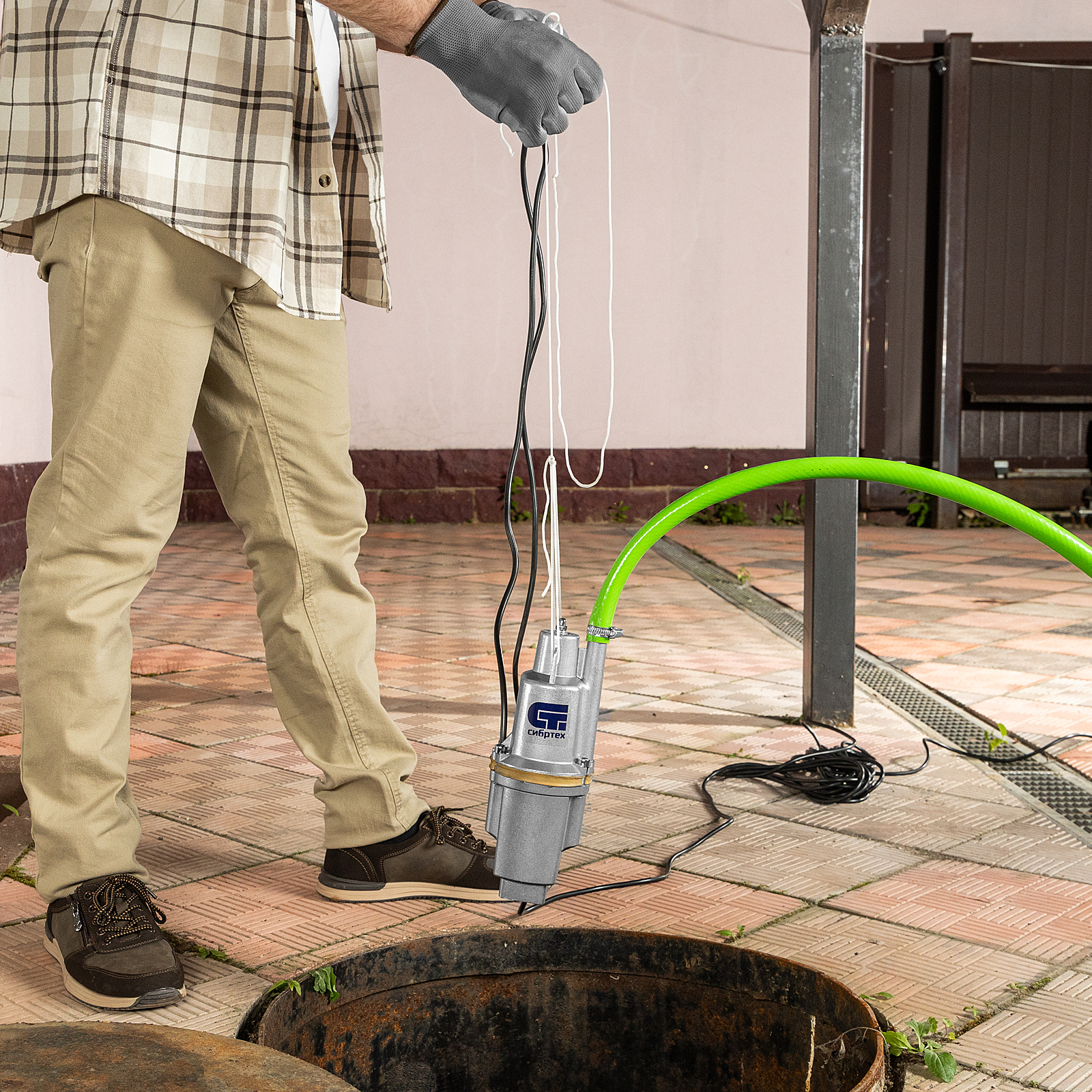 - Простой монтаж — с помощью троса, закрепленного в проушинах на корпусе, насос нужно опустить в колодец или резервуар и зафиксировать в вертикальном положении.