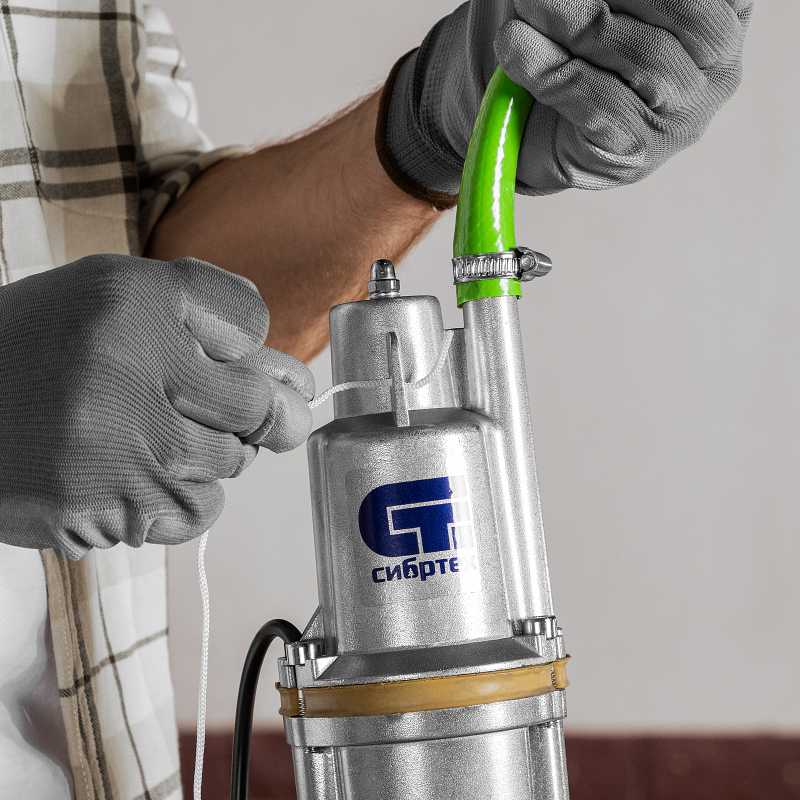 - Необходимые аксессуары в комплекте — трос для погружения и хомут для закрепления шланга прилагаются к насосу.