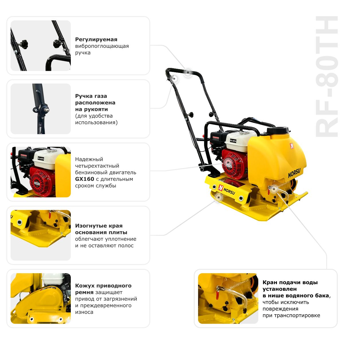 Виброплита бензиновая прямоходная NORSU RF-80TH (колесный комплект, бак для воды) в Екатеринбурге