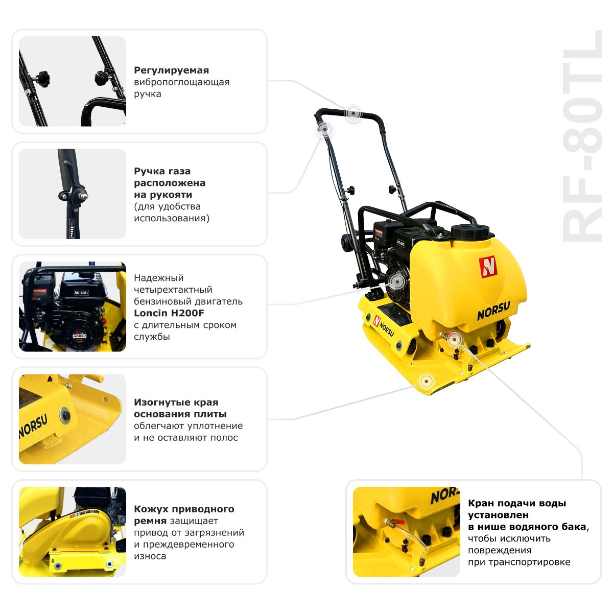 Виброплита бензиновая прямоходная NORSU RF-80TL (колесный комплект, бак для воды) в Екатеринбурге