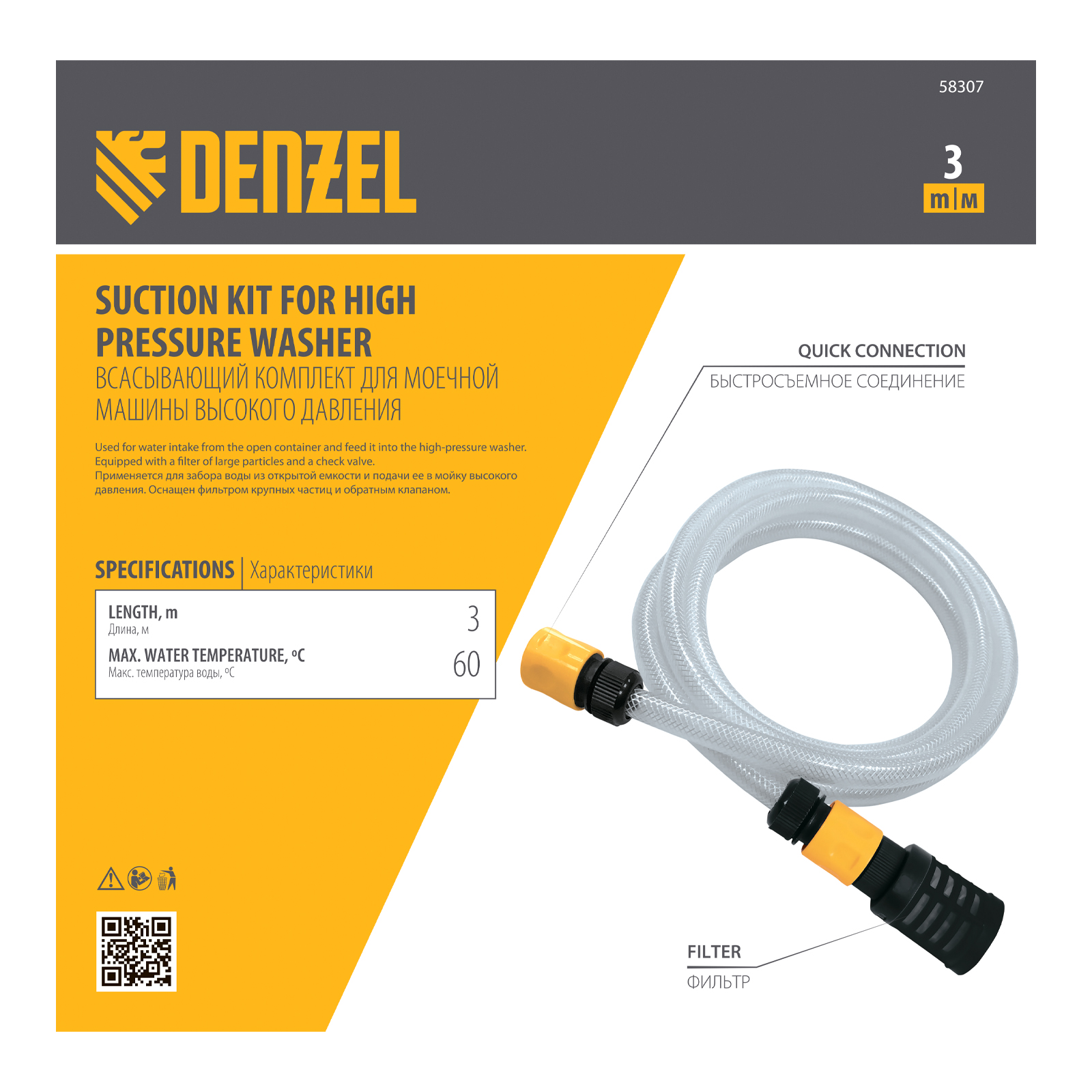 Всасывающий комплект Denzel 58307 с длиной шланга 3 м и диаметром 1/2 дюйма устанавливается на моечные машины высокого давления серии R. С его помощью мойка может работать без подключения к водопроводу, набирая воду из различных резервуаров, в том числе из естественных водоемов.